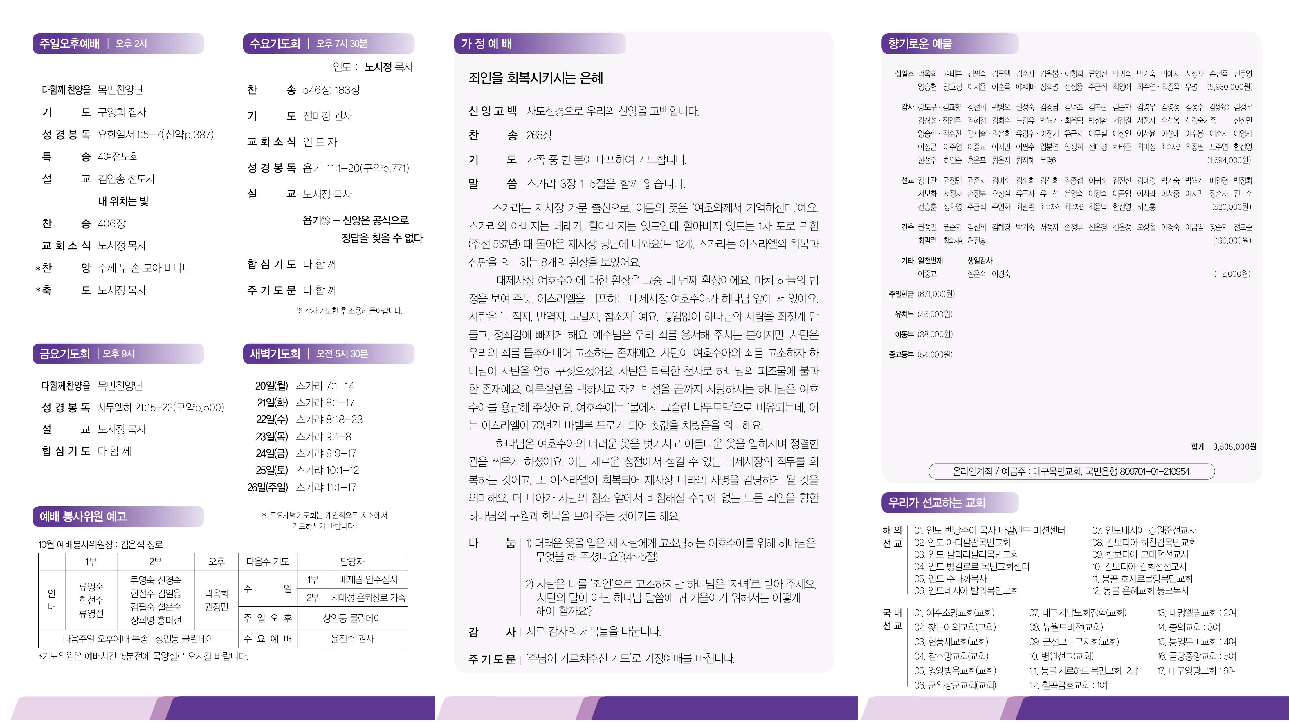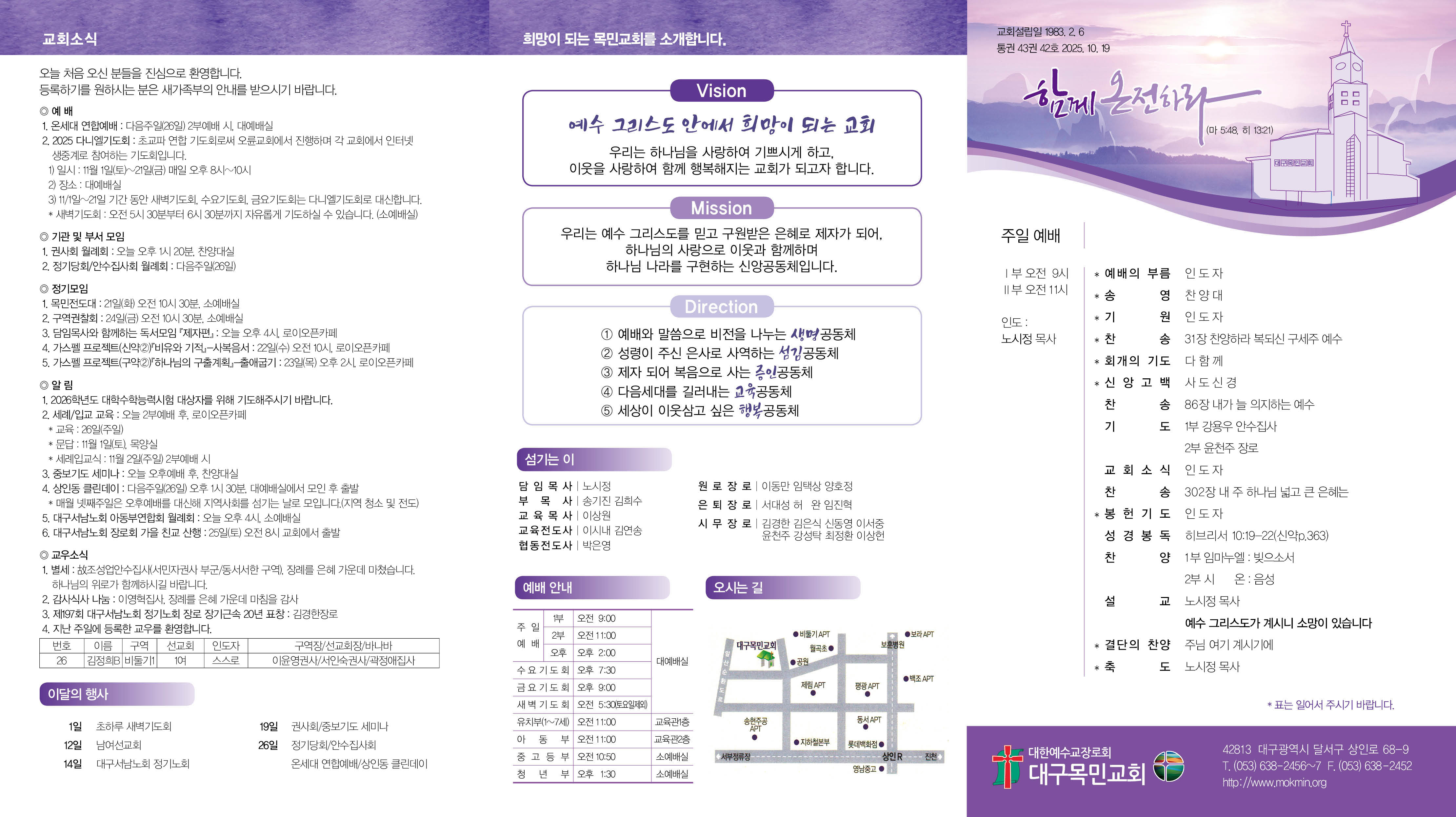 ¡Ý ¿¹ ¹è 1. ¿Â¼¼´ë ¿¬ÇÕ¿¹¹è : ´ÙÀ½ÁÖÀÏ(26ÀÏ) 2ºÎ¿¹¹è ½Ã, ´ë¿¹¹è½Ç 2. 2025 ´Ù´Ï¿¤±âµµÈ¸ : Ãʱ³ÆÄ ¿¬ÇÕ ±âµµÈ¸·Î½á ¿À·û±³È¸¿¡¼ ÁøÇàÇÏ¸ç °¢ ±³È¸¿¡¼ ÀÎÅÍ³Ý »ýÁß°è·Î Âü¿©ÇÏ´Â ±âµµÈ¸ÀÔ´Ï´Ù. 1) ÀϽà : 11¿ù 1ÀÏ(Åä)~21ÀÏ(±Ý) ¸ÅÀÏ ¿ÀÈÄ 8½Ã~10½Ã 2) Àå¼Ò : ´ë¿¹¹è½Ç 3) 11/1ÀÏ~21ÀÏ ±â°£ µ¿¾È »õº®±âµµÈ¸, ¼ö¿ä±âµµÈ¸, ±Ý¿ä±âµµÈ¸´Â ´Ù´Ï¿¤±âµµÈ¸·Î ´ë½ÅÇÕ´Ï´Ù. * »õº®±âµµÈ¸ : ¿ÀÀü 5½Ã 30ºÐºÎÅÍ 6½Ã 30ºÐ±îÁö ÀÚÀ¯·Ó°Ô ±âµµÇÏ½Ç ¼ö ÀÖ½À´Ï´Ù. (¼Ò¿¹¹è½Ç)